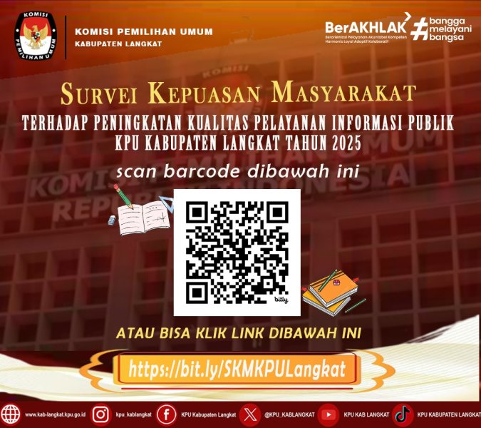 #temanpemilih, dalam rangka peningkatan kualitas pelayanan informasi publik, KPU Kabupaten Langkat menyelenggarakan survei kepuasan masyarakat Tahun 2025. Kami harap kesediaan #temanpemilih untuk mengisi kuesioner yang telah kami sediakan. Partisipasi anda sangat berharga bagi kami dalam memberikan pelayanan yang semakin baik. ISI SURVEI.... KLIK DISINI #kpumelayani