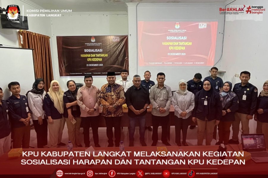 #TemanPemilih, KPU Kabupaten Langkat melaksanakan kegiatan Sosialisasi Harapan dan Tantangan KPU Kedepan, Selasa (23/12/2025). Acara dibuka secara langsung oleh Ketua KPU Kabupaten Langkat, Husni Mustofa didampingi oleh Anggota KPU Kabupaten Langkat Divisi SDM dan Parhubmas, Imran Lubis, Divisi Teknis Penyelenggara, Fery Nanda RajaGukguk dan Divisi Perencanaan, Data dan Informasi, Magfirah Fitri Menjerang. Kegiatan Sosialisasi ini bertujuan untuk Mewujudkan Pemilu yang Berintegritas dan Profesional, Harapan agar penyelenggara pemilu, dari pusat hingga tingkat ad hoc, bekerja secara profesional dan menjunjung tinggi kode etik dan Tantangan besar dalam menangkal disinformasi, berita bohong (hoaks), dan praktik politik uang yang merusak kualitas demokrasi. Narasumber pada kegiatan ini adalah Yulhasni, Dosen Universitas Muhammadiyah Sumatera Utara dan Dr. Aminuddin, S.Sos, MA, C.IP, Dosen UINSU Medan. Kegiatan ini diikuti oleh Sekretaris KPU Kabupaten Langkat, Cut Cinta Dewi, Kasubbag dan Staf Sekretariat KPU Kabupaten Langkat. #KPUMelayani ....