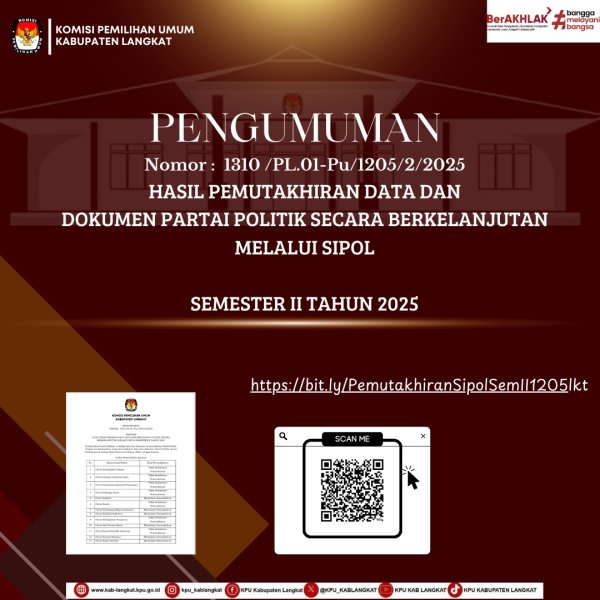 #temanpemilih, Berikut Kami Sampaikan Pengumuman Komisi Pemilihan Umum Kabupaten Langkat Nomor :1310/PL.01-Pu/1205/2/2025 Tentang Pengumuman Hasil Pemutakhiran Data dan Dokumen Partai Politik Secara Berkelanjutan Melalui SIPOL Semester II Tahun 2025. #KPUMelayani ....