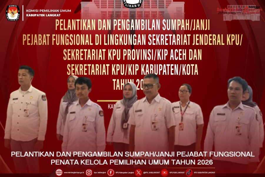 #TemanPemilih, KPU Kabupaten Langkat mengikuti Pelantikan dan Pengambilan Sumpah/Janji Pejabat Fungsional Penata Kelola Pemilihan Umum di Lingkungan Sekretariat Jenderal KPU/Sekretariat KPU Provinsi/KIP Aceh dan Sekretariat KPU Kabupaten/Kota yang diselenggarakan oleh KPU RI secara daring melalui zoom meeting di Aula Kantor KPU Kabupaten Langkat yang dimulai pada pukul 14.00 wib, Kamis (22/01/2026). Sebanyak Delapan Aparatur Sipil Negara Sekretariat KPU Kabupaten Langkat dilantik dan diambil sumpah/janjinya yaitu Hotnida Siregar, Santi Hariati, Neny Rafiani, Tota Sanggam Pakpahan, Tengku Badrun Isa, Tengku Sheilla Noviza, T.Nuzul Khair, Juari. Pelantikan dan Pengambilan Sumpah/Janji dipimpin langsung oleh Sekretaris Jenderal Komisi Pemilihan Umum Republik Indonesia, Bernad Dermawan Sutrisno. Pelantikan dan Pengambilan Sumpah/Janji Pejabat Fungsional Penata Kelola Pemilihan Umum ini merupakan bagian dari penataan organisasi dan pengingkatan profesionalime Aparatur Sipil Negara di lingkungan Komisi Pemilihan Umum yang bertujuan untuk meningkatkan kualitas penyelenggaraan Pemilu melalui penguatan sumber daya manusia yang profesional dan kompeten. Turut hadir pada kegiatan Sekretaris KPU Kabupaten Langkat, Cut Cinta Dewi, Kasubbag Hukum dan SDM, Nova Versita Perangin-Angin serta staf subbagian Parhubmas dan SDM KPU Kabupaten Langkat. #KPUMelayani ....