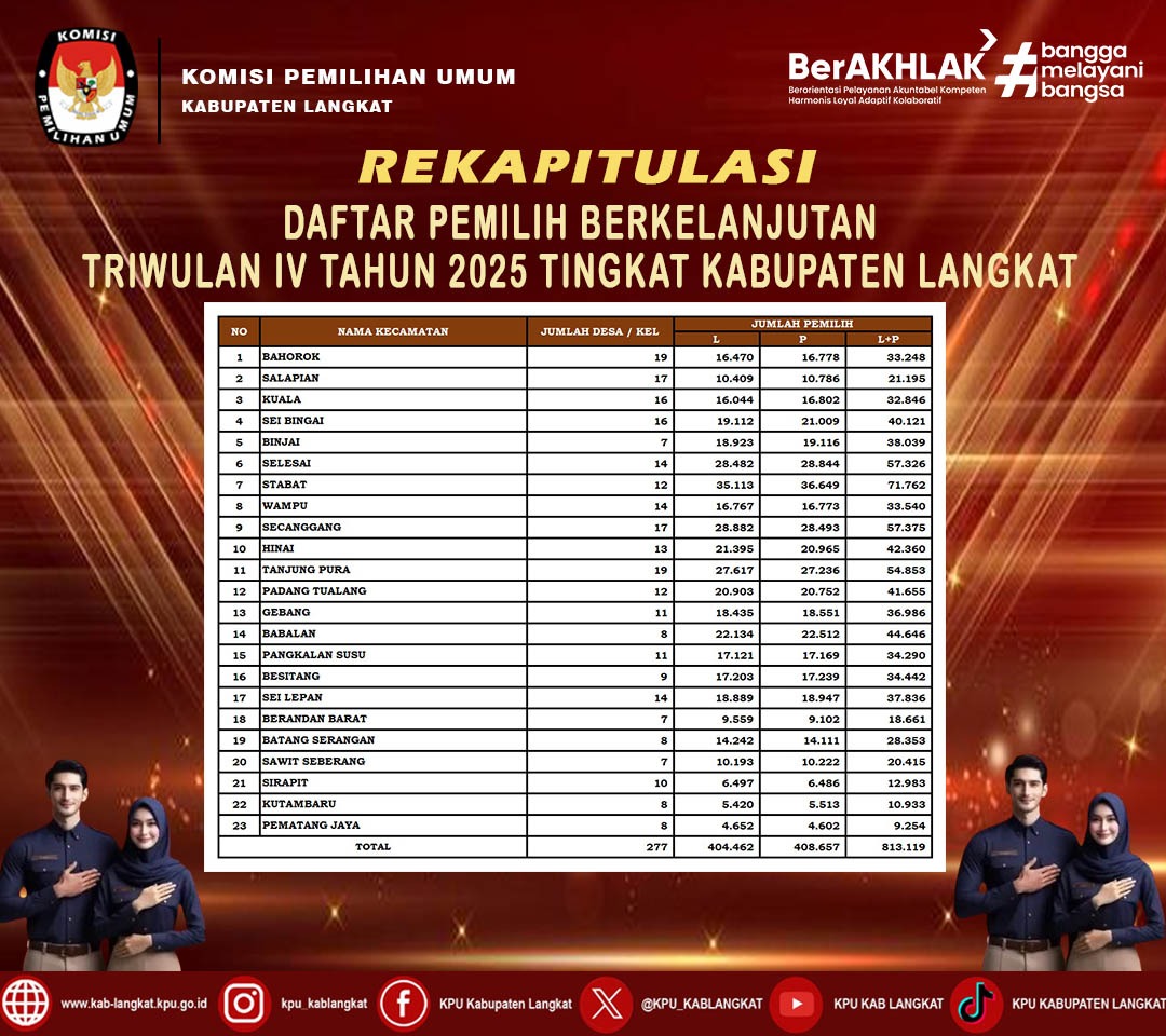 Hasil Rekapitulasi Pemutakhiran Data Pemilih Berkelanjutan (PDPB) ini berdasarkan Keputusan Komisi Pemilihan Umum Kabupaten Langkat Nomor 59 Tahun 2025 tentang Penetapan Rekapitulasi Pemutakhiran Data Pemilih Berkelanjutan Kabupaten Langkat Provinsi Sumatera Utara Triwulan IV Tahun 2025.