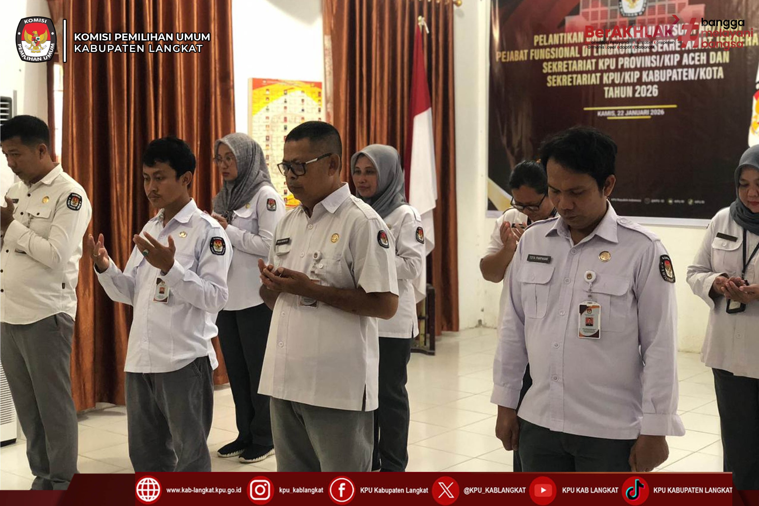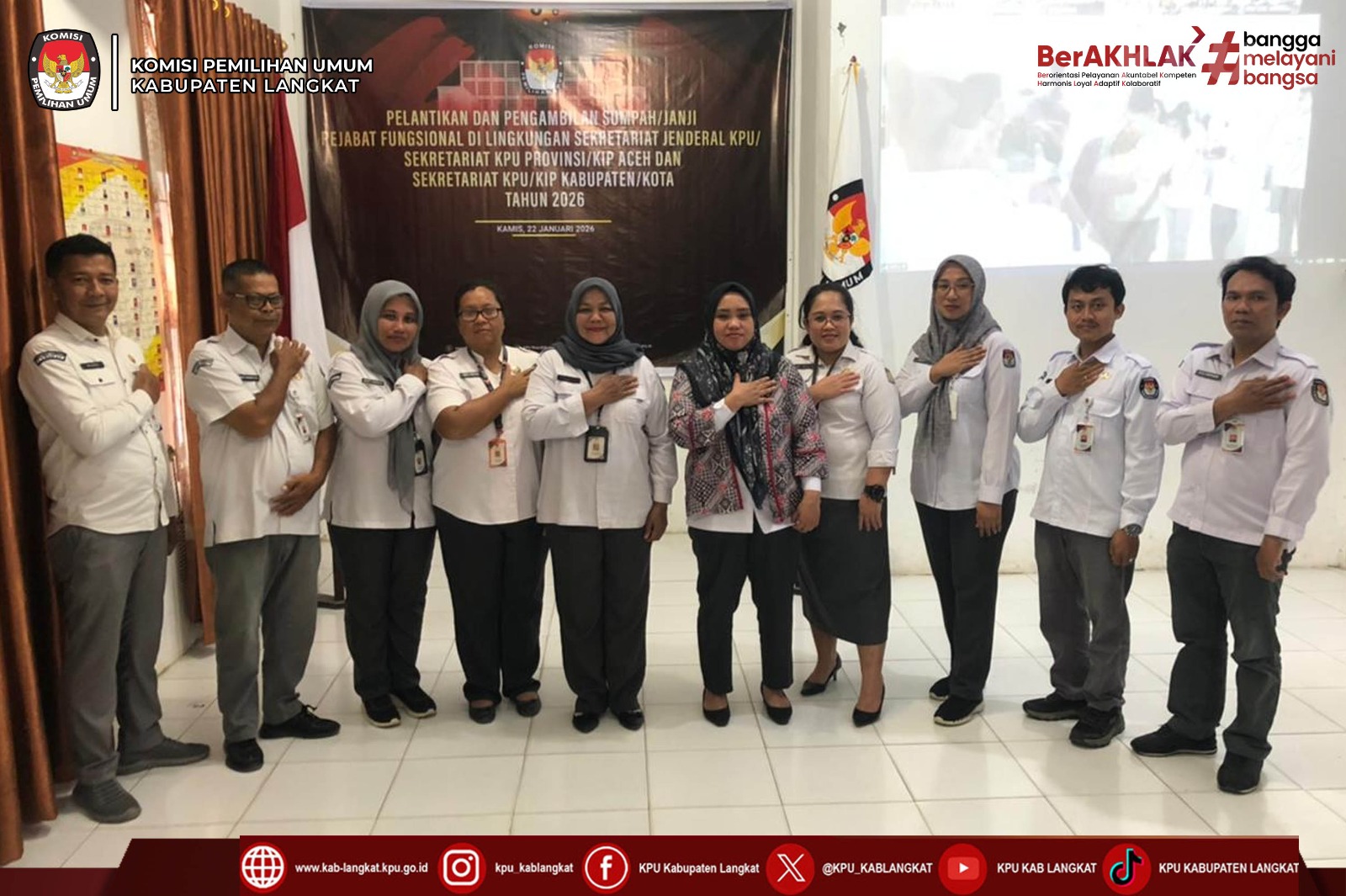 #TemanPemilih, KPU Kabupaten Langkat mengikuti Pelantikan dan Pengambilan Sumpah/Janji Pejabat Fungsional Penata Kelola Pemilihan Umum di Lingkungan Sekretariat Jenderal KPU/Sekretariat KPU Provinsi/KIP Aceh dan Sekretariat KPU Kabupaten/Kota yang diselenggarakan oleh KPU RI secara daring melalui zoom meeting di Aula Kantor KPU Kabupaten Langkat yang dimulai pada pukul 14.00 wib, Kamis (22/01/2026).