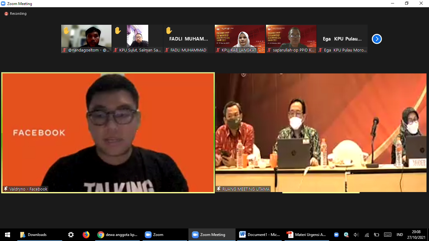 KPU turut menghadirkan narasumber Noudhy Valdryno dari Facebook Indonesia. Menurut Noudhy sebelum meningkatkan enggagement media sosial, pastikan akun aman terlebih dulu. “Selalu gunakan kata sandi yang kuat,” kata Noudhy yang juga menjabat sebagai Manajer Kebijkan Publik Facebook Indonesia. “Jika akun sudah aman, selanjutnya menghubungkan diri dengan audiens atau pengikut dengan memperhatikan tren yang sedang berlaku agar media sosial yang dikelola selalu tampil menarik,” imbuhnya lagi.