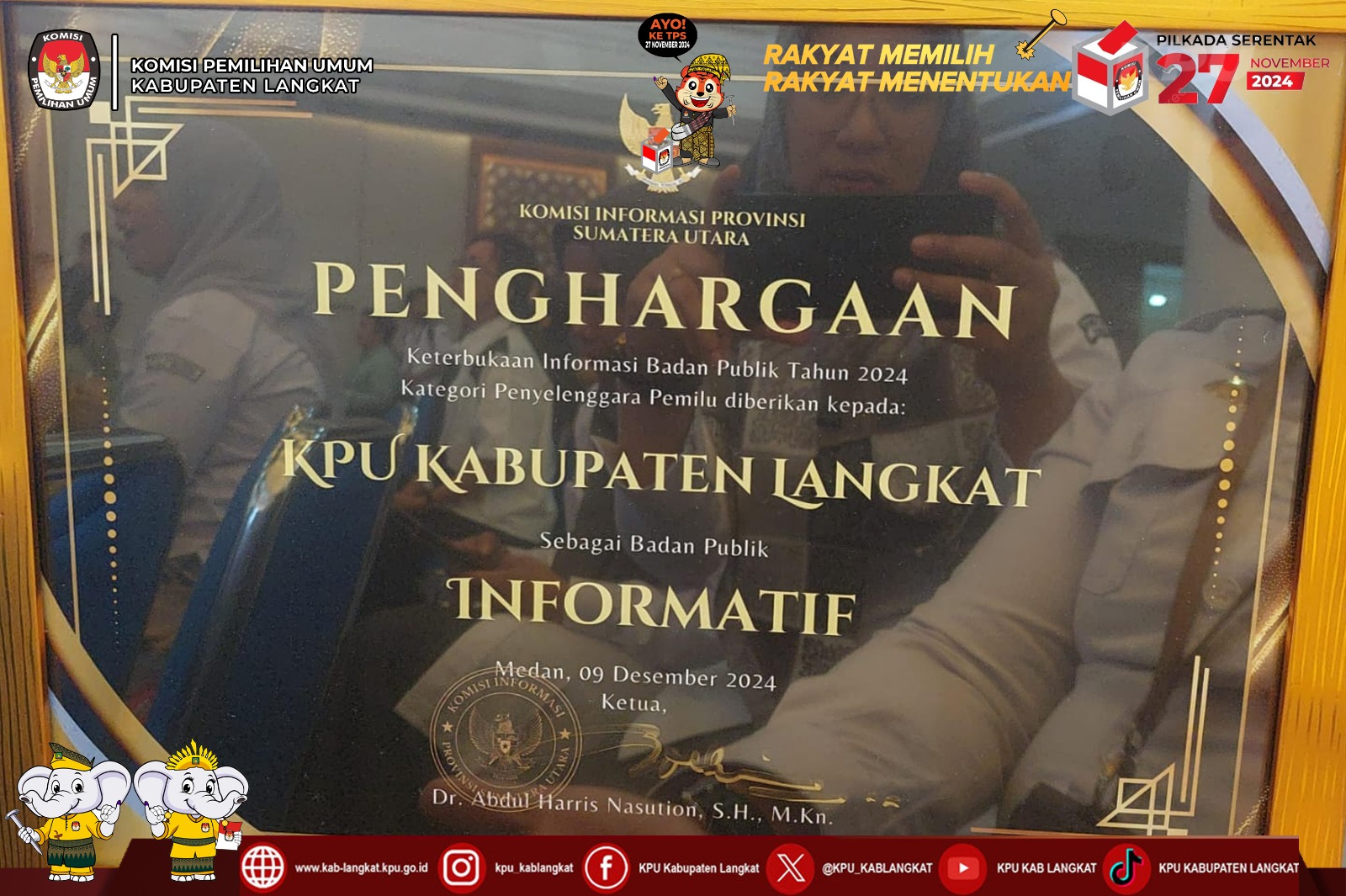 #temanpemilih, KPU Kabupaten Langkat menerima penghargaan keterbukaan informasi badan publik tahun 2024 pada hari Senin (09/12/2024) di Kantor Gubernur Sumatera Utara.