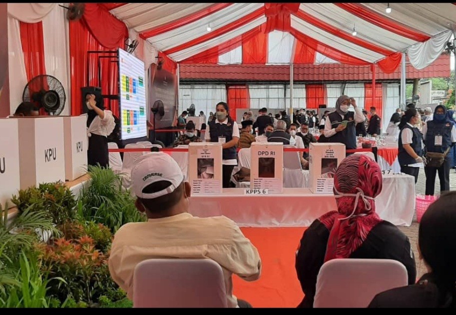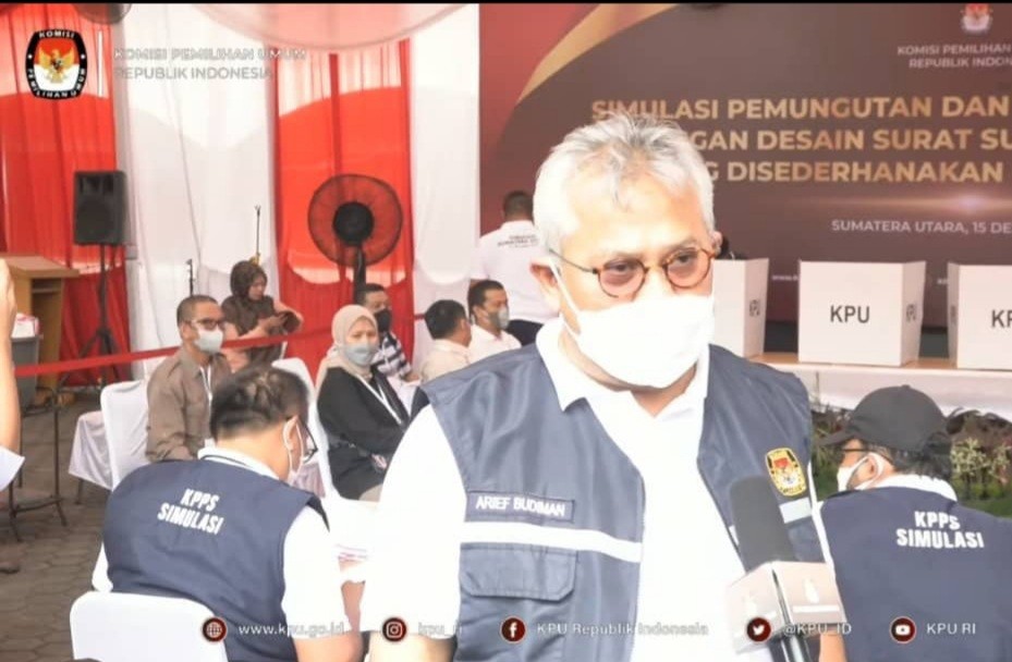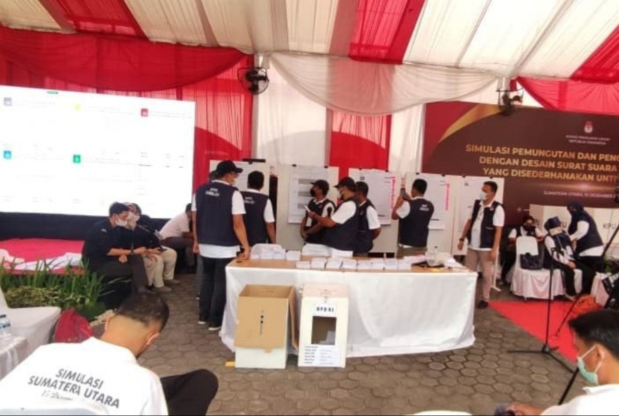 KPU Kabupaten Langkat menghadiri Simulasi Pemungutan dan Penghitungan Suara dengan Desain Surat Suara dan Formulir yang Disederhanakan untuk Pemilu 2024 di halaman Kantor KPU Provinsi Sumatera Utara pada Rabu, 15 Desember 2021.