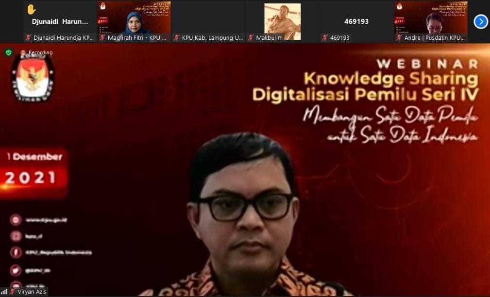 KPU kembali menyelenggarakan Weebinar Digitalisasi Pemilu Seri 4 bertema Knowledge Sharing Membangun Satu Data Pemilu untuk Satu Data Indonesia pada Rabu, 1 Desember 2021. Kegiatan secara daring dan diikuti oleh KPU Provinsi dan KPU Kabupaten/Kota se-Indonesia, partai politik dan media massa.