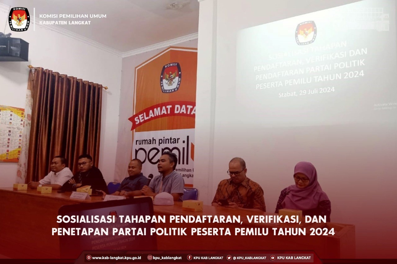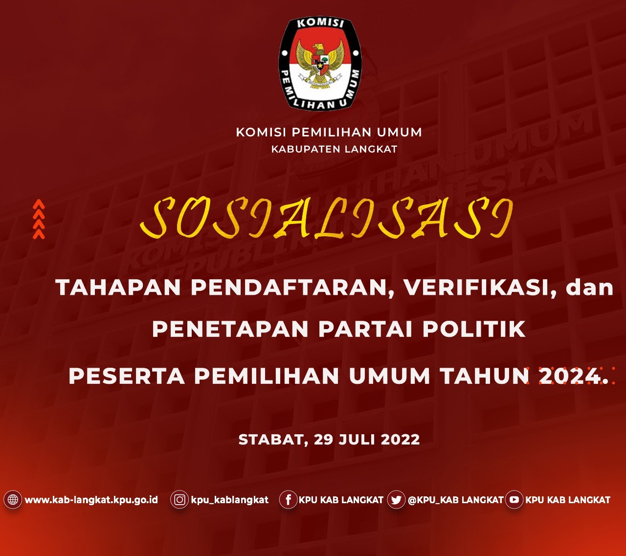 KPU Kabupaten Langkat melaksanakan Sosialisasi Tahapan Pendaftaran, Verifikasi, dan Penetapan Partai Politik Peserta Pemilihan Umum Tahun 2024, pada Jumat, 29 Juli 2022 di aula Kantor KPU Kabupaten Langkat.