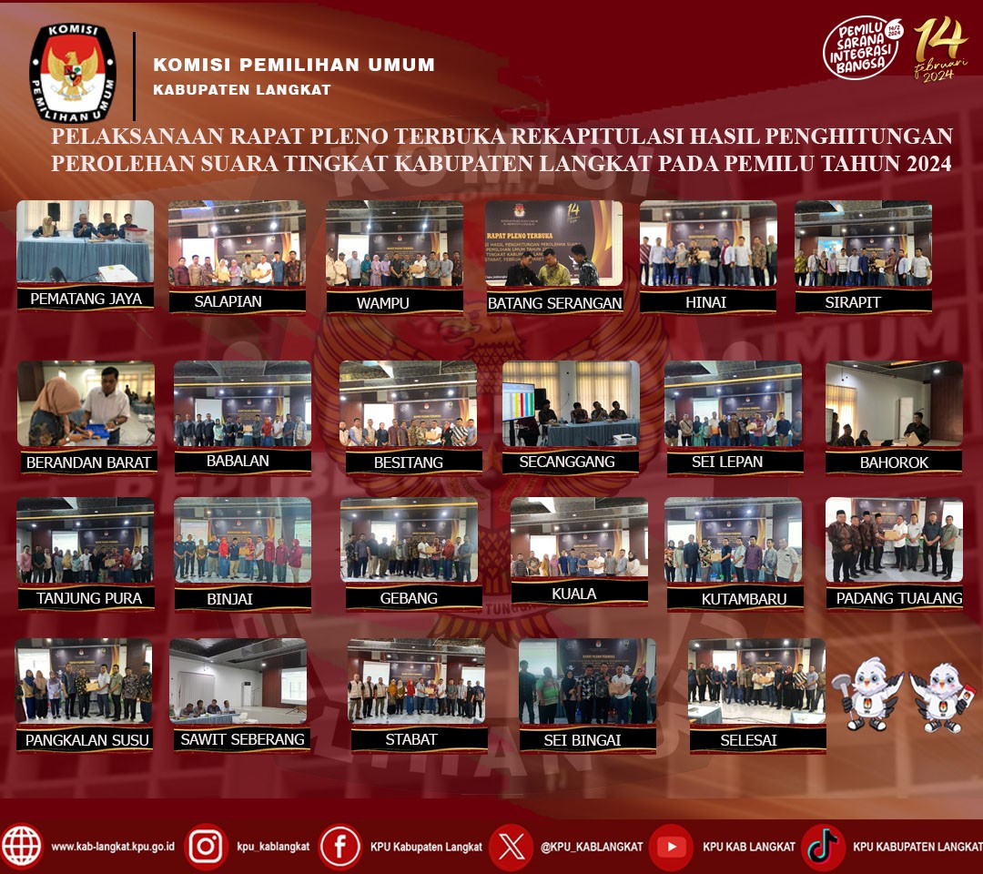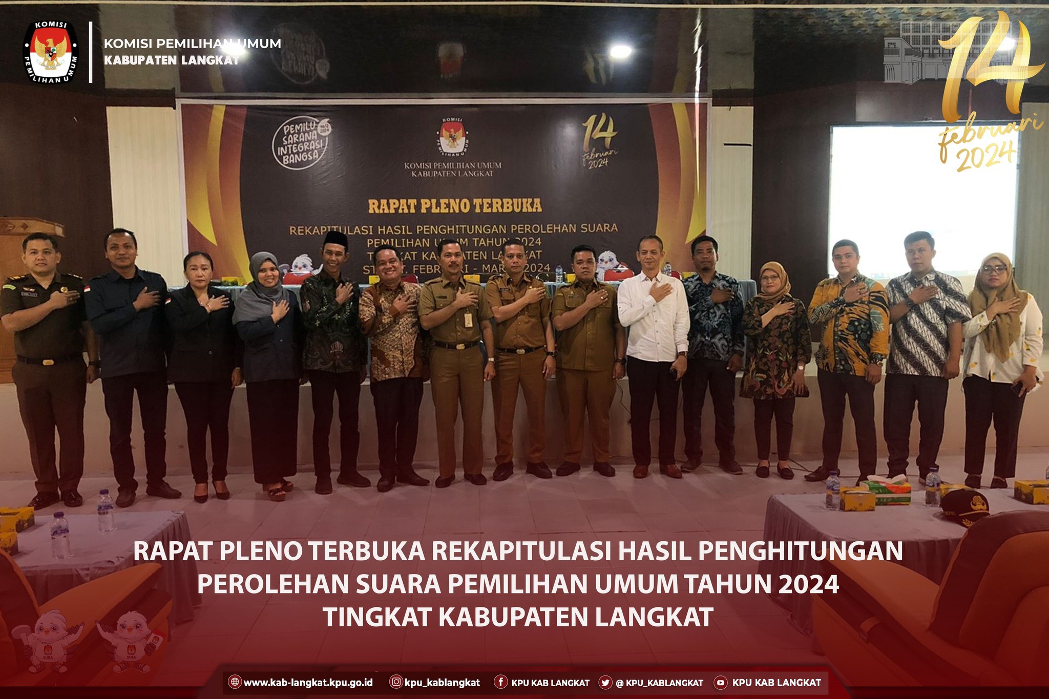 #TemanPemilih, KPU Langkat melaksanakan Rapat Pleno Terbuka Rekapitulasi dan Penetapan Rekapitulasi Hasil Penghitungan Perolehan Suara Tingkat Kabupaten Langkat Pada Pemilihan Umum Tahun 2024 bertempat di Aula Gedung Pegnasos Stabat, Senin 26 Februari 2024 s.d Selasa 5 Maret 2024.
