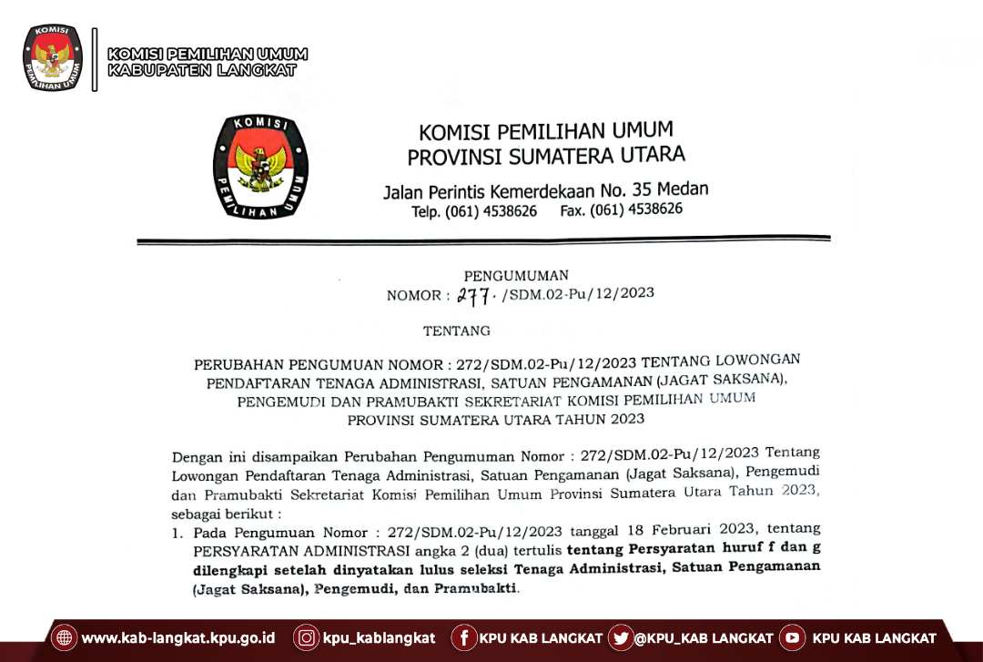 #TemanPemilih, Pengumuman Nomor 272/SDM.02-Pu/12/2023 tentang Lowongan Pendaftaran Tenaga Administrasi, Satuan Pengamanan (Jagat Saksana), Pengemudi dan Pramubakti Sekretariat Komisi Pemilihan Umum Provinsi Sumatera Utara Tahun 2023