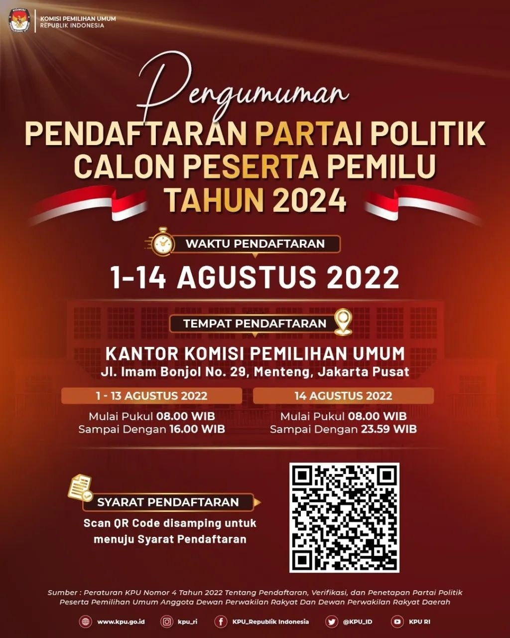 PENGUMUMAN NOMOR 7/PL.01.1-Pu/05/2022 TENTANG PENDAFTARAN PARTAI POLITIK CALON PESERTA PEMILU TAHUN 2024 Komisi Pemilihan Umum membuka pendaftaran Partai Politik Calon Peserta Pemilihan Umum Tahun 2024 dengan ketentuan sebagai berikut: A. DOKUMEN PENDAFTARAN 1. surat pendaftaran Partai Politik; 2. surat pernyataan dari Pimpinan Partai Politik tingkat pusat yang dibuat menggunakan formulir MODEL F-SURAT.PERNYATAAN-PARPOL yang ditandatangani oleh Pimpinan Partai Politik tingkat pusat dibubuhi cap Partai Politik dan meterai yang cukup, yang menyatakan bahwa: data dan dokumen persyaratan Partai Politik calon peserta Pemilu yang telah diinput dan diunggah melalui Sipol benar dan lengkap sesuai dengan peraturan perundang-undangan; memiliki Berita Negara Republik Indonesia yang menyatakan partai politik tersebut terdaftar sebagai badan hukum; memiliki salinan AD dan ART yang disahkan oleh menteri yang menyelenggarakan urusan pemerintahan di bidang hukum dan hak asasi manusia; memiliki kepengurusan Partai Politik di seluruh provinsi, 75% (tujuh puluh lima persen) dari jumlah kabupaten/kota dalam wilayah kepengurusan tingkat provinsi, dan 50% (lima puluh persen) dari jumlah kecamatan dalam wilayah kepengurusan tingkat kabupaten/kota; menyertakan paling sedikit 30% (tiga puluh persen) keterwakilan perempuan pada kepengurusan Partai Politik tingkat pusat dan memperhatikan 30% (tiga puluh persen) keterwakilan perempuan pada kepengurusan Partai Politik tingkat provinsi dan kabupaten/kota; memiliki anggota sekurang-kurangnya 1.000 (seribu) orang atau 1/1.000 (satu per seribu) orang dari jumlah Penduduk pada kepengurusan Partai Politik tingkat kabupaten/kota dengan kepemilikan KTA dan KTP-el atau KK anggota Partai Politik; mempunyai Kantor Tetap yang digunakan sebagai kesekretariatan dalam menjalankan fungsi Partai Politik pada setiap kepengurusan Partai Politik tingkat pusat, provinsi, dan kabupaten/kota sampai tahapan terakhir Pemilu dibuktikan dengan surat keterangan tentang Kantor Tetap pengurus Partai Politik pada tingkat pusat, provinsi, dan kabupaten/kota menggunakan formulir MODEL F-KANTOR.TETAP-PARPOL yang dilampiri rekapitulasi daftar Kantor Tetap pengurus Partai Politik pada tingkat pusat, provinsi, dan kabupaten/kota; memiliki surat keterangan tentang pendaftaran Partai Politik sebagai badan hukum yang memuat nama, lambang, dan tanda gambar Partai Politik dari menteri yang menyelenggarakan urusan pemerintahan di bidang hukum dan hak asasi manusia disertai dengan lambang dan tanda gambar Partai Politik berwarna; dan menyerahkan bukti kepemilikan nomor rekening atas nama Partai Politik pada tingkat pusat, provinsi, dan kabupaten/kota kepada KPU. 3. rekapitulasi jumlah pengurus dan anggota Partai Politik calon peserta Pemilu menggunakan formulir MODEL F-REKAP.PENDAFTARAN-PARPOL. B. WAKTU DAN TEMPAT PELAKSANAAN PENDAFTARAN 1. Waktu Pendaftaran Hari/Tanggal : Senin, 1 Agustus s.d. Sabtu, 13 Agustus 2022 Waktu : Pukul 08:00 WIB s.d. 16:00 WIB Hari/Tanggal : Minggu, 14 Agustus 2022 Waktu : Pukul 08:00 WIB s.d. 23:59 WIB 2. Tempat Pendaftaran Kantor KPU Jl Imam Bonjol No. 29, Jakarta Pusat C. LAIN-LAIN 1. Ketentuan Pengajuan Pendaftaran Partai Politik calon peserta Pemilu dapat mengajukan pendaftaran setelah mengirimkan data dan dokumen persyaratan yang diunggah melalui Sipol. Pendaftaran dilakukan oleh Pimpinan Partai Politik tingkat pusat yang sah sesuai dengan keputusan Pimpinan Partai Politik tingkat pusat tentang kepengurusan Partai Politik tingkat pusat yang disahkan oleh menteri yang menyelenggarakan urusan pemerintahan di bidang hukum dan hak asasi manusia. Dalam hal Pimpinan Partai Politik tingkat pusat tidak dapat hadir pada saat pendaftaran, dapat diwakilkan oleh Pengurus Partai Politik Tingkat Pusat atau Petugas Penghubung tingkat pusat yang diberi kuasa. Dokumen pendaftaran ditandatangani oleh Pimpinan Partai Politik tingkat pusat yang sah sesuai dengan keputusan Pimpinan Partai Politik tingkat pusat tentang kepengurusan Partai Politik tingkat pusat yang disahkan oleh menteri yang menyelenggarakan urusan pemerintahan di bidang hukum dan hak asasi manusia, dibubuhi cap Partai Politik, dan dicetak dari Sipol. 2. Dalam hal pemeriksaan kelengkapan berkas pendaftaran ditemukan: a. isian data dan unggahan dokumen persyaratan menjadi peserta Pemilu tidak lengkap; b. dokumen pendaftaran tidak lengkap; dan c. dokumen pendaftaran tidak dicetak dari Sipol, KPU mengembalikan dokumen pendaftaran Partai Politik calon peserta Pemilu. 3. Partai Politik calon peserta Pemilu yang dikembalikan dokumen pendaftarannya sebagaimana dimaksud pada angka 2 masih dapat melakukan pendaftaran sampai dengan batas akhir waktu pendaftaran pada Hari terakhir. 4. Dokumen pendaftaran Partai Politik calon Peserta Pemilu sebagaimana dimaksud pada huruf A dapat diunduh pada laman https://sipol.kpu.go.id 5. Pelayanan dan penjelasan informasi terkait pendaftran Partai Politik calon peserta Pemilu dapat menghubungi helpdesk KPU a. Telephone (021) 3916322 dan (021) 3916323 pada hari kerja pada pukul 08.00 s.d 17.00 WIB b. No Hp Sdri. Riyani Indriastuti (08170047707) dan Sdr. Firdaus Pandu Aji (083808797981) c. email : sipol@kpu.go.id