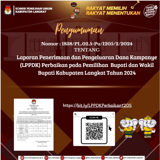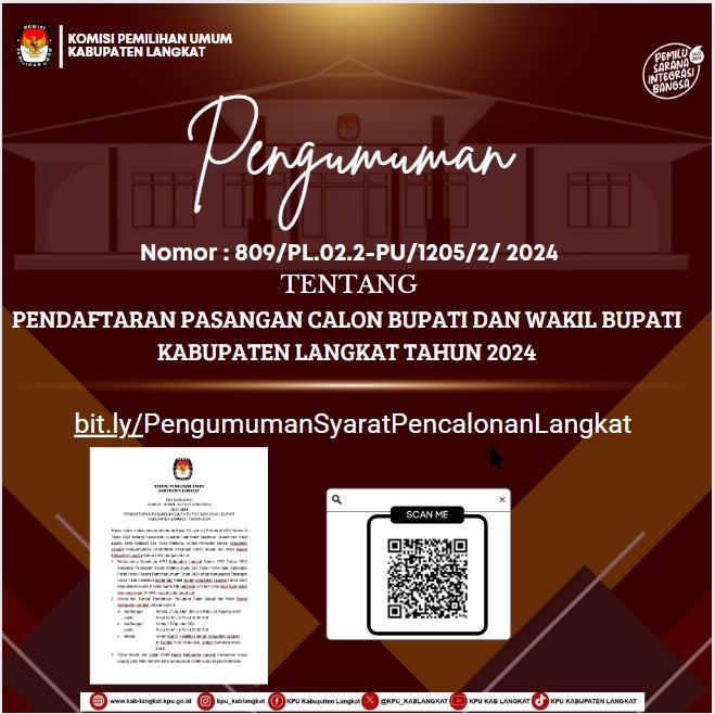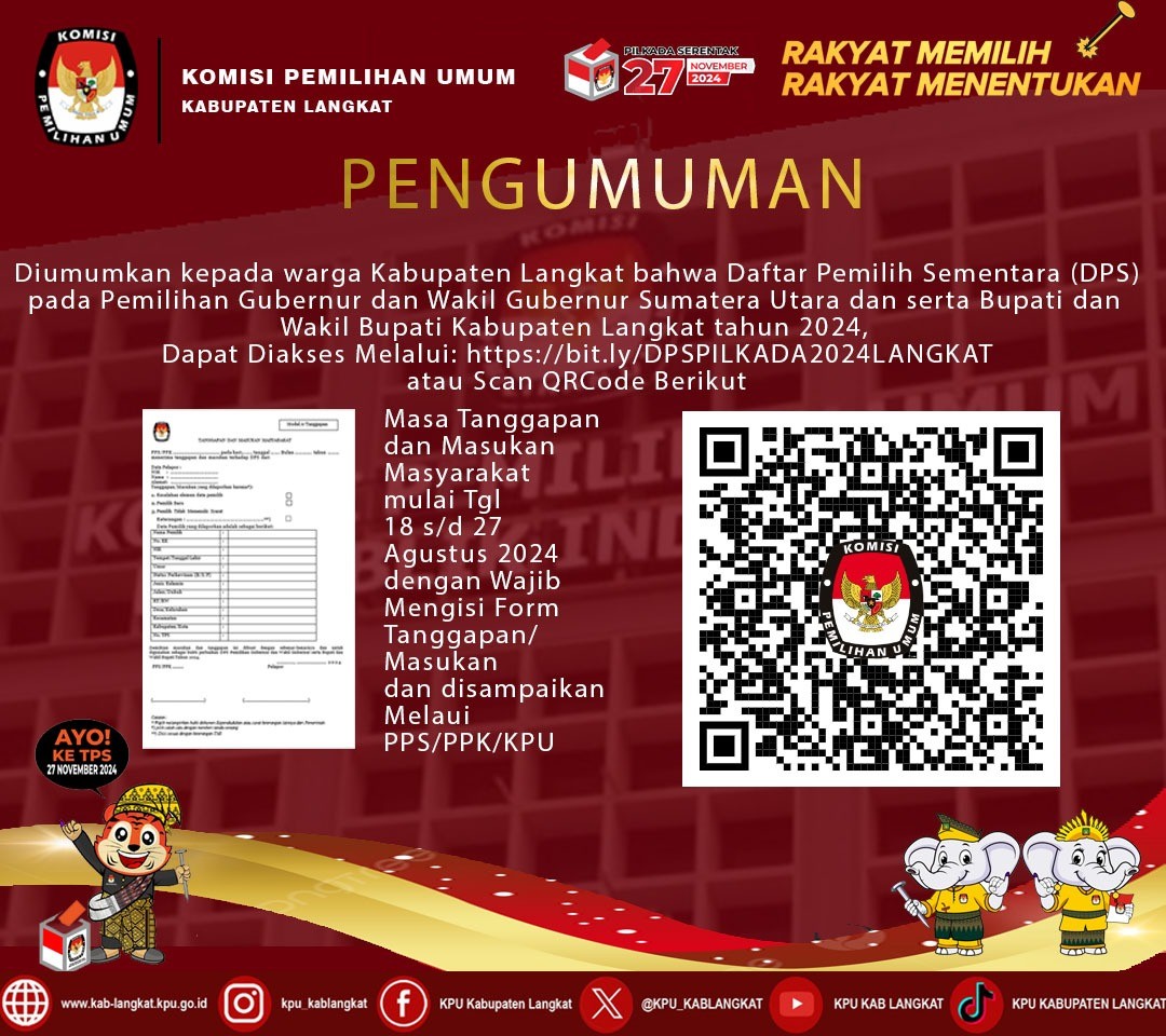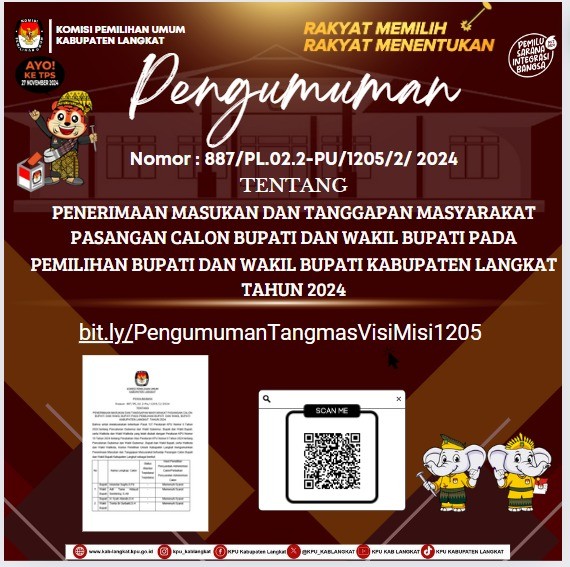 #TemanPemilih, berikut Pengumuman KPU Kab. Langkat Nomor: 887/PL.02.2-PU/1205/2/2024 tentang PENERIMAAN MASUKAN DAN TANGGAPAN MASYARAKAT PASANGAN CALON BUPATI DAN WAKIL BUPATI PADA PEMILIHAN BUPATI DAN WAKIL BUPATI KABUPATEN LANGKAT TAHUN 2024
