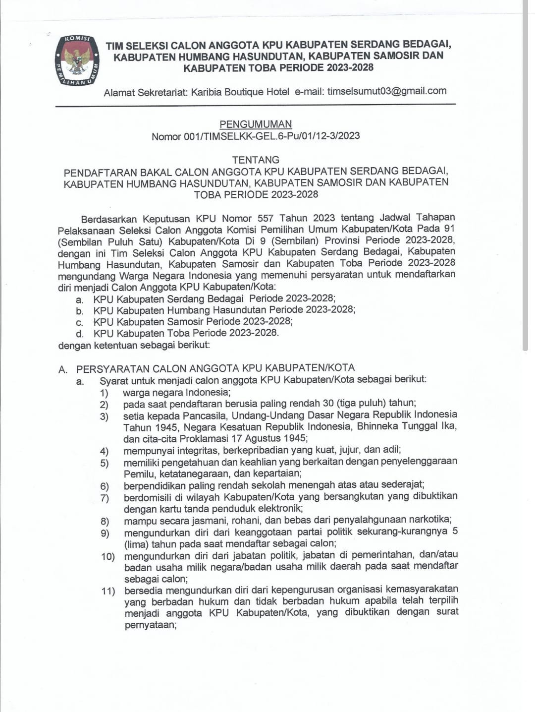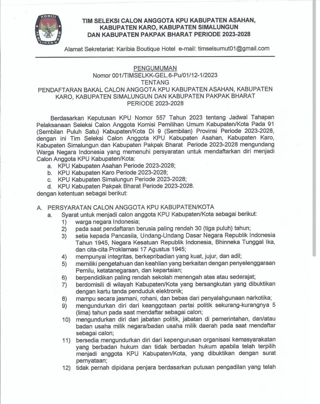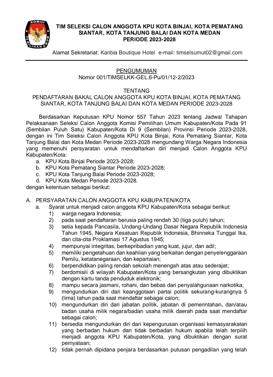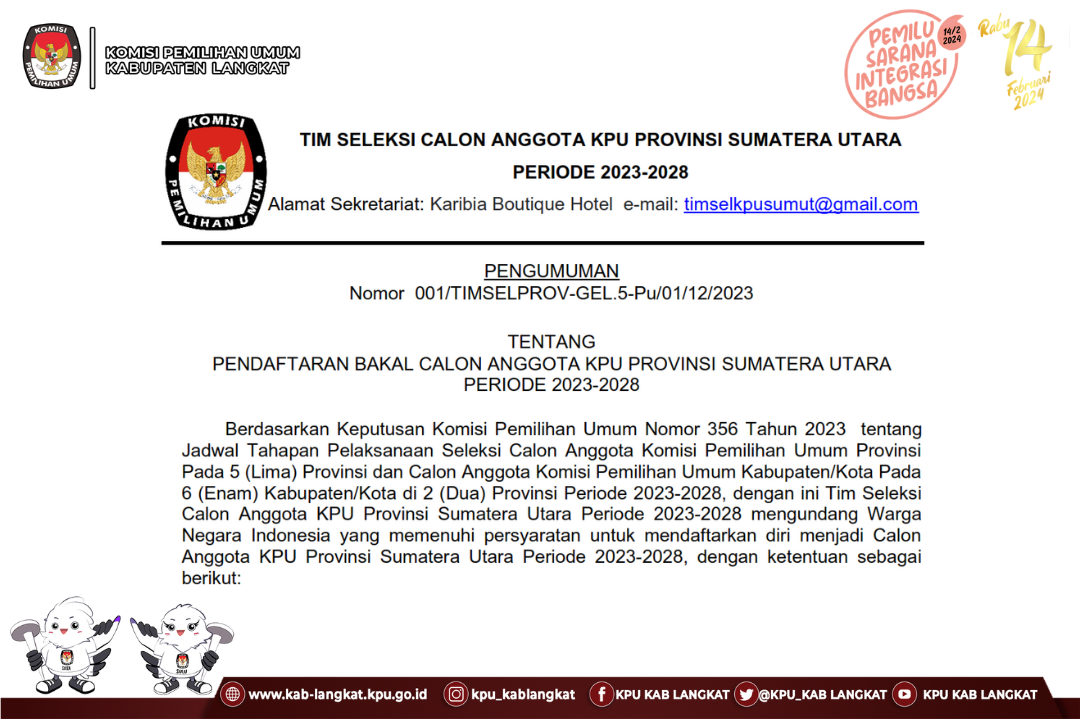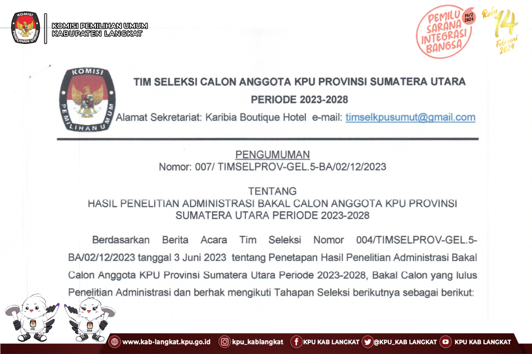 Pengumuman Nomor 007/TIMSELPROV-GEL.5-BA/02/12/2023 tentang Hasil Penelitian Administrasi Bakal Calon Anggota KPU Provinsi Sumatera Utara Periode 2023-2028